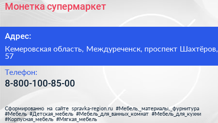 Монетка, супермаркет по адресу Кемеровская область, Междуреченск, проспект Шахтёров, 57 в дальнейшем Организация, размещена в следующих категориях: