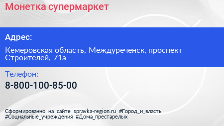 Монетка, супермаркет по адресу Кемеровская область, Междуреченск, проспект Строителей, 71а в дальнейшем Организация, размещена в следующих категориях: