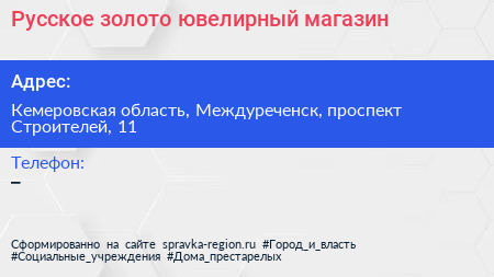Русское золото, ювелирный магазин по адресу Кемеровская область, Междуреченск, проспект Строителей, 11 в дальнейшем Организация, размещена в следующих категориях: