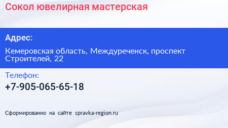 Сокол, ювелирная мастерская по адресу Кемеровская область, Междуреченск, проспект Строителей, 22 в дальнейшем Организация, размещена в следующих категориях:
