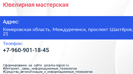 Ювелирная мастерская по адресу Кемеровская область, Междуреченск, проспект Шахтёров, 21 в дальнейшем Организация, размещена в следующих категориях: