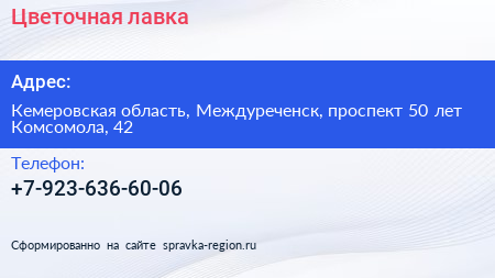 Цветочная лавка по адресу Кемеровская область, Междуреченск, проспект 50 лет Комсомола, 42 в дальнейшем Организация, размещена в следующих категориях: