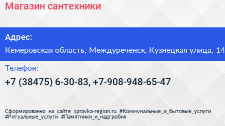 Магазин сантехники по адресу Кемеровская область, Междуреченск, Кузнецкая улица, 14 в дальнейшем Организация, размещена в следующих категориях: