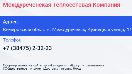 Междуреченская Теплосетевая Компания по адресу Кемеровская область, Междуреченск, Кузнецкая улица, 11 в дальнейшем Организация, размещена в следующих категориях: