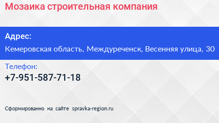 Мозаика, строительная компания по адресу Кемеровская область, Междуреченск, Весенняя улица, 30 в дальнейшем Организация, размещена в следующих категориях: