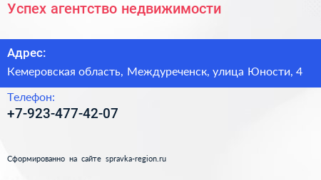 Успех, агентство недвижимости по адресу Кемеровская область, Междуреченск, улица Юности, 4 в дальнейшем Организация, размещена в следующих категориях: