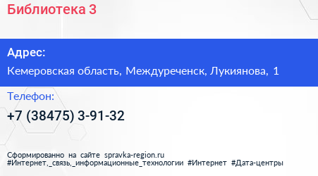 Библиотека №3 по адресу Кемеровская область, Междуреченск, Лукиянова, 1 в дальнейшем Организация, размещена в следующих категориях: