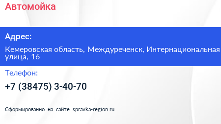 Автомойка по адресу Кемеровская область, Междуреченск, Интернациональная улица, 16 в дальнейшем Организация, размещена в следующих категориях: