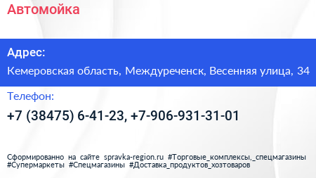 Автомойка по адресу Кемеровская область, Междуреченск, Весенняя улица, 34 в дальнейшем Организация, размещена в следующих категориях: