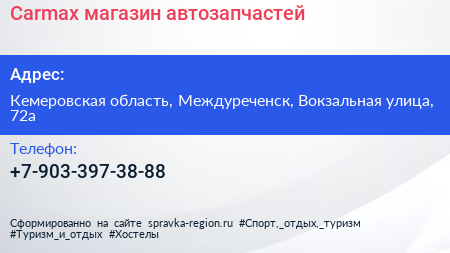 Carmax, магазин автозапчастей по адресу Кемеровская область, Междуреченск, Вокзальная улица, 72а в дальнейшем Организация, размещена в следующих категориях: