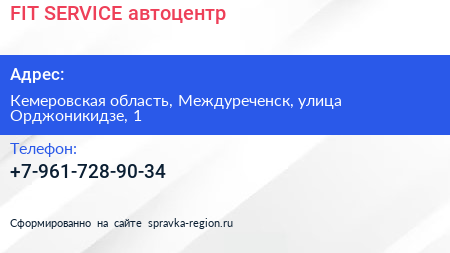 FIT SERVICE, автоцентр по адресу Кемеровская область, Междуреченск, улица Орджоникидзе, 1 в дальнейшем Организация, размещена в следующих категориях: