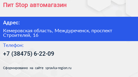 Пит Stop, автомагазин по адресу Кемеровская область, Междуреченск, проспект Строителей, 16 в дальнейшем Организация, размещена в следующих категориях: