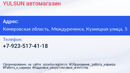 YULSUN, автомагазин по адресу Кемеровская область, Междуреченск, Кузнецкая улица, 5 в дальнейшем Организация, размещена в следующих категориях: