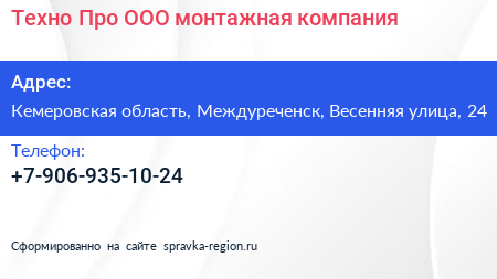 Техно Про, ООО, монтажная компания по адресу Кемеровская область, Междуреченск, Весенняя улица, 24 в дальнейшем Организация, размещена в следующих категориях: