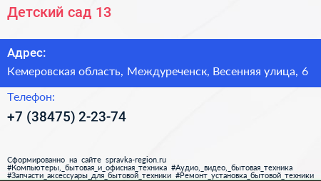 Детский сад №13 по адресу Кемеровская область, Междуреченск, Весенняя улица, 6 в дальнейшем Организация, размещена в следующих категориях: