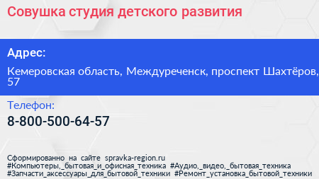 Совушка, студия детского развития по адресу Кемеровская область, Междуреченск, проспект Шахтёров, 57 в дальнейшем Организация, размещена в следующих категориях: