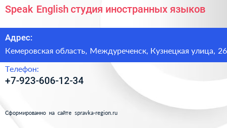 Speak English, студия иностранных языков по адресу Кемеровская область, Междуреченск, Кузнецкая улица, 26 в дальнейшем Организация, размещена в следующих категориях: