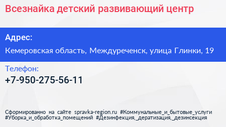 Всезнайка, детский развивающий центр по адресу Кемеровская область, Междуреченск, улица Глинки, 19 в дальнейшем Организация, размещена в следующих категориях: