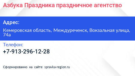 Азбука Праздника, праздничное агентство по адресу Кемеровская область, Междуреченск, Вокзальная улица, 74а в дальнейшем Организация, размещена в следующих категориях: