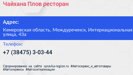 Чайхана Плов, ресторан по адресу Кемеровская область, Междуреченск, Интернациональная улица, 43а в дальнейшем Организация, размещена в следующих категориях: