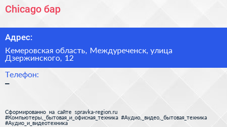 Chicago, бар по адресу Кемеровская область, Междуреченск, улица Дзержинского, 12 в дальнейшем Организация, размещена в следующих категориях: