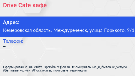 Drive Cafe, кафе по адресу Кемеровская область, Междуреченск, улица Горького, 9/1 в дальнейшем Организация, размещена в следующих категориях: