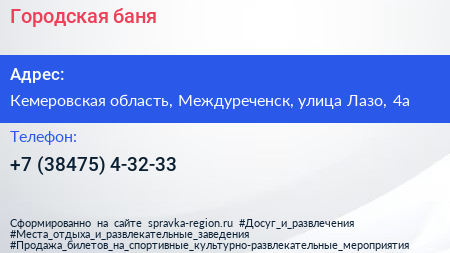 Городская баня по адресу Кемеровская область, Междуреченск, улица Лазо, 4а в дальнейшем Организация, размещена в следующих категориях: