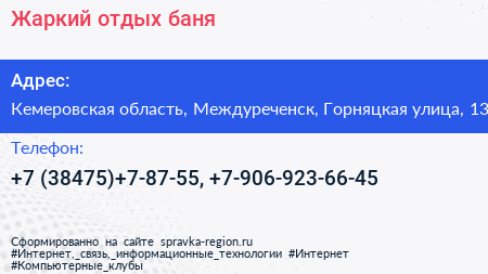 Жаркий отдых, баня по адресу Кемеровская область, Междуреченск, Горняцкая улица, 13 в дальнейшем Организация, размещена в следующих категориях: