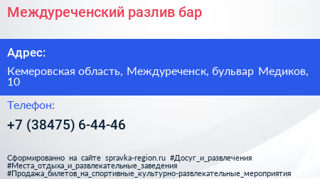 Междуреченский разлив, бар по адресу Кемеровская область, Междуреченск, бульвар Медиков, 10 в дальнейшем Организация, размещена в следующих категориях: