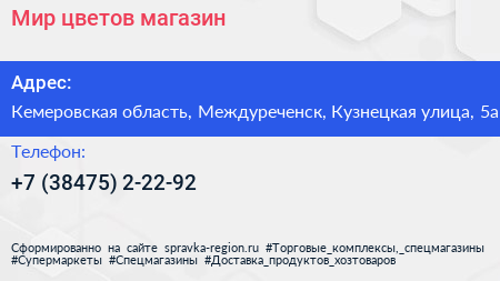 Мир цветов, магазин по адресу Кемеровская область, Междуреченск, Кузнецкая улица, 5а в дальнейшем Организация, размещена в следующих категориях: