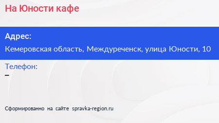 На Юности, кафе по адресу Кемеровская область, Междуреченск, улица Юности, 10 в дальнейшем Организация, размещена в следующих категориях: