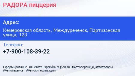 РАДОРА, пиццерия по адресу Кемеровская область, Междуреченск, Партизанская улица, 123 в дальнейшем Организация, размещена в следующих категориях: