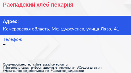 Распадский хлеб, пекарня по адресу Кемеровская область, Междуреченск, улица Лазо, 41 в дальнейшем Организация, размещена в следующих категориях: