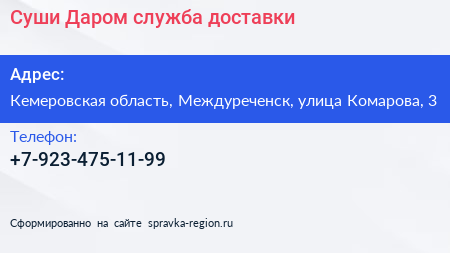 Суши Даром, служба доставки по адресу Кемеровская область, Междуреченск, улица Комарова, 3 в дальнейшем Организация, размещена в следующих категориях: