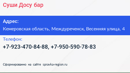 Суши-Досу, бар по адресу Кемеровская область, Междуреченск, Весенняя улица, 4 в дальнейшем Организация, размещена в следующих категориях: