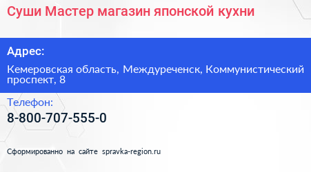 Суши Мастер, магазин японской кухни по адресу Кемеровская область, Междуреченск, Коммунистический проспект, 8 в дальнейшем Организация, размещена в следующих категориях: