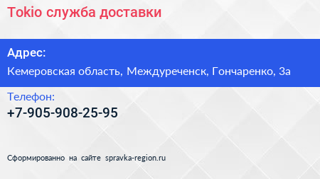 Tokio, служба доставки по адресу Кемеровская область, Междуреченск, Гончаренко, 3а в дальнейшем Организация, размещена в следующих категориях: