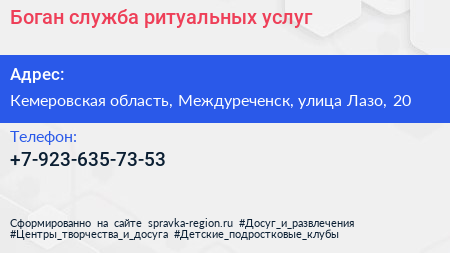 Боган, служба ритуальных услуг по адресу Кемеровская область, Междуреченск, улица Лазо, 20 в дальнейшем Организация, размещена в следующих категориях: