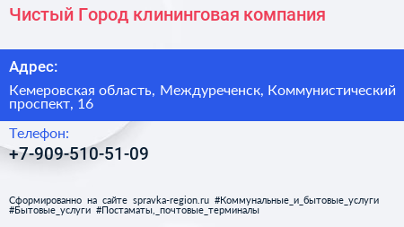 Чистый Город, клининговая компания по адресу Кемеровская область, Междуреченск, Коммунистический проспект, 16 в дальнейшем Организация, размещена в следующих категориях: