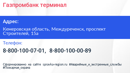 Газпромбанк, терминал по адресу Кемеровская область, Междуреченск, проспект Строителей, 15а в дальнейшем Организация, размещена в следующих категориях: