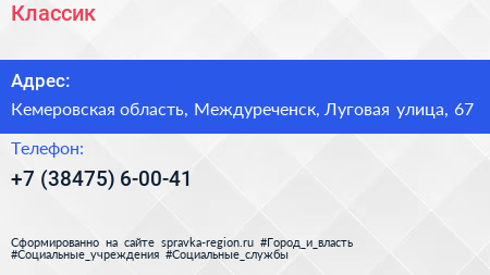 Классик по адресу Кемеровская область, Междуреченск, Луговая улица, 67 в дальнейшем Организация, размещена в следующих категориях: