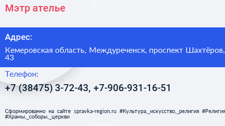 Мэтр, ателье по адресу Кемеровская область, Междуреченск, проспект Шахтёров, 43 в дальнейшем Организация, размещена в следующих категориях: