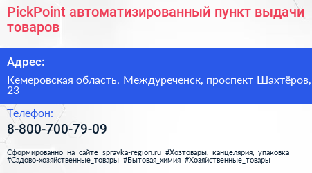 PickPoint, автоматизированный пункт выдачи товаров по адресу Кемеровская область, Междуреченск, проспект Шахтёров, 23 в дальнейшем Организация, размещена в следующих категориях: