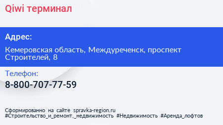 Qiwi, терминал по адресу Кемеровская область, Междуреченск, проспект Строителей, 8 в дальнейшем Организация, размещена в следующих категориях: