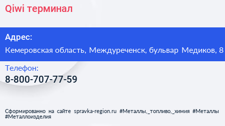 Qiwi, терминал по адресу Кемеровская область, Междуреченск, бульвар Медиков, 8 в дальнейшем Организация, размещена в следующих категориях: