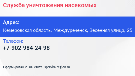 Служба уничтожения насекомых по адресу Кемеровская область, Междуреченск, Весенняя улица, 25 в дальнейшем Организация, размещена в следующих категориях: