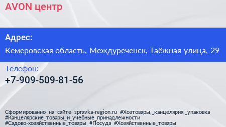 AVON, центр по адресу Кемеровская область, Междуреченск, Таёжная улица, 29 в дальнейшем Организация, размещена в следующих категориях: