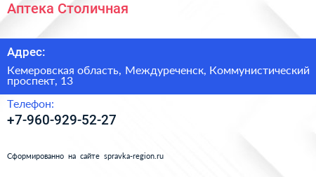Аптека Столичная по адресу Кемеровская область, Междуреченск, Коммунистический проспект, 13 в дальнейшем Организация, размещена в следующих категориях: