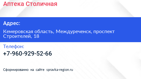 Аптека Столичная по адресу Кемеровская область, Междуреченск, проспект Строителей, 18 в дальнейшем Организация, размещена в следующих категориях: