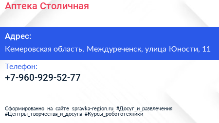 Аптека Столичная по адресу Кемеровская область, Междуреченск, улица Юности, 11 в дальнейшем Организация, размещена в следующих категориях: